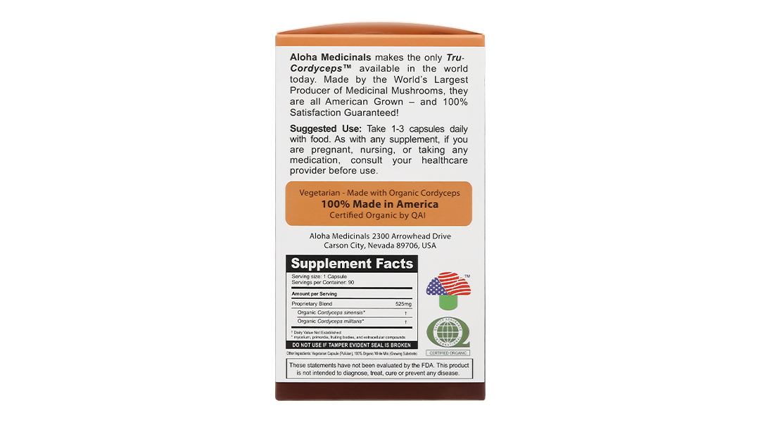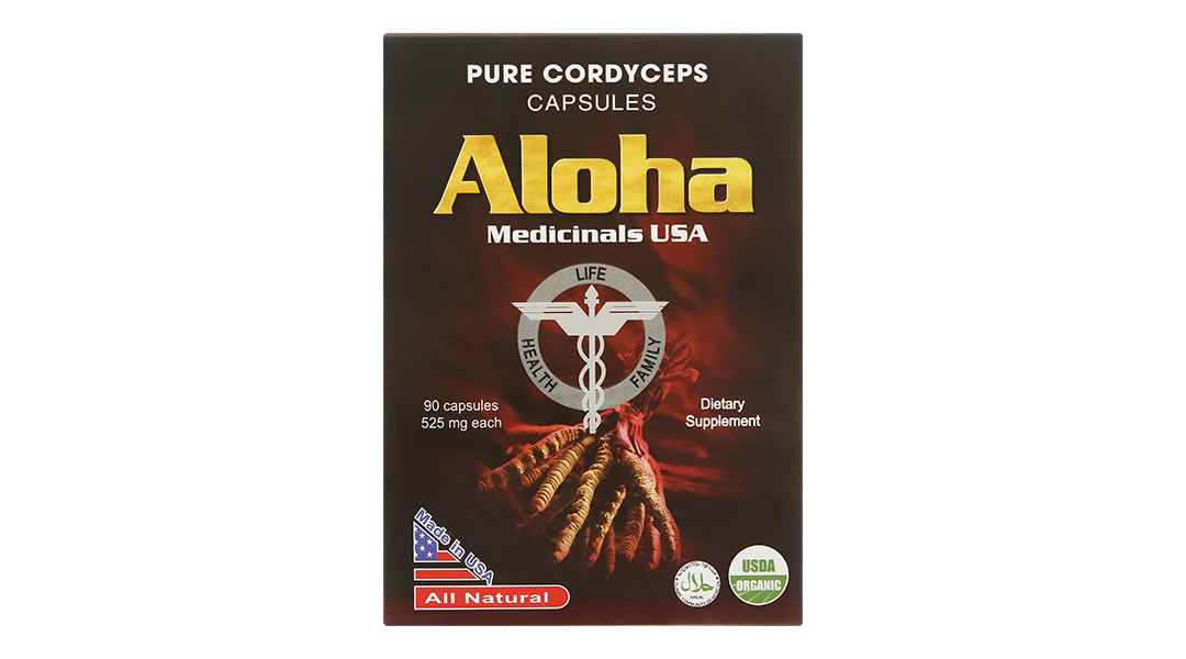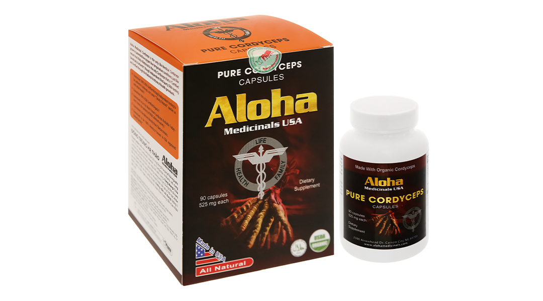 - Aloha Pure Cordyceps là một sản phẩm đến từ công ty Aloha Medicinals, một trong những công ty hàng đầu hiện nay trong việc trồng nấm dược liệu, đã được chứng nhận hữu cơ của USDA và EU và hiện đang được phân phối ở nhiều quốc gia trong đó có Việt Nam. Sản phẩm được bào chế dưới dạng viên nang dễ dùng, được chia sẵn liều và dễ bảo quản.