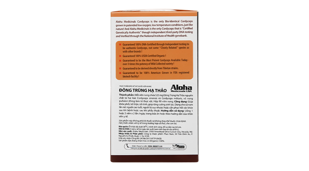 - Viên nang Aloha Pure Cordyceps có thành phần là 100% Đông trùng hạ thảo nguyên chất, được nuôi trồng và kiểm định theo đúng quy trình đạt chứng nhận USDA – Chứng nhận hữu cơ nghiêm ngặt nhất hiện nay và chứng nhận QAI – Chứng nhận tiêu chuẩn của Mỹ, bảo đảm chất lượng an toàn và hiệu quả cao cho người sử dụng.