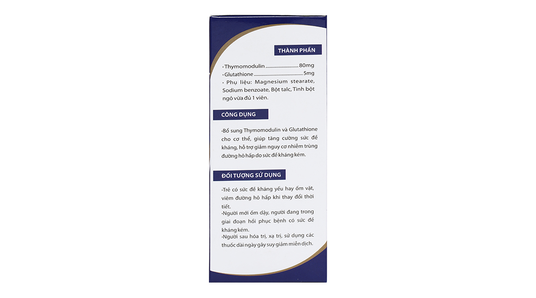 Bổ sung Thymomodulin và Glutathione cho cơ thể, giúp tăng cường sức đề kháng, hỗ trợ giảm nguy cơ nhiễm trùng đường hô hấp do sức đề kháng kém.