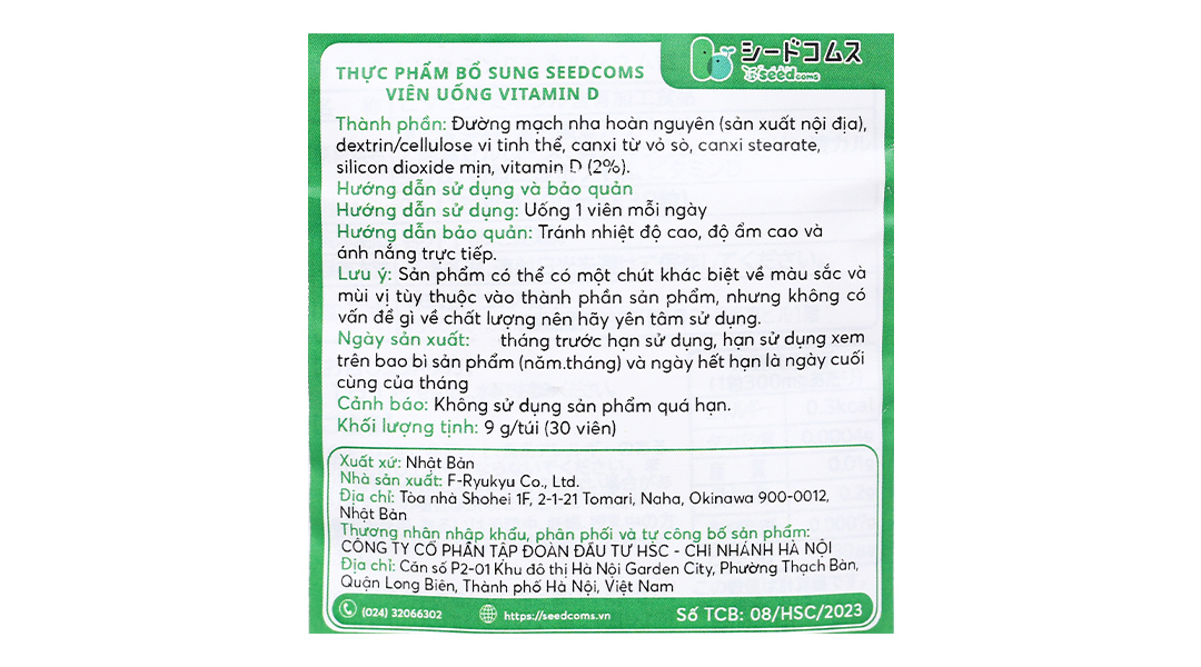 Seedcoms Vitamin D là thực phẩm bổ sung với thành phần chính gồm có vitamin D và Canxi từ vỏ sò, Canxi stearate giúp bỏ sung canxi và viatmin D cho cơ thể, duy trì sức khỏe xương và răng cũng như giúp tăng cường hệ miễn dịch.