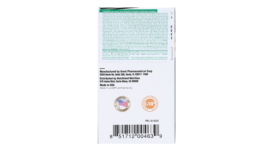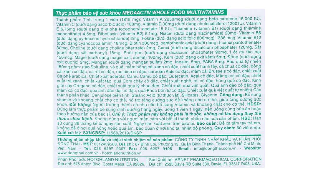 MegaActiv – sản phẩm đến từ thương hiệu Hotchland Nutrition, là giải pháp tuyệt vời để bổ sung đầy đủ vitamin và khoáng chất cần thiết cho cơ thể. Hotchland Nutrition, một thương hiệu nổi tiếng tại Mỹ với hàng trăm sản phẩm dinh dưỡng chất lượng cao, đã áp dụng quy trình sản xuất nghiêm ngặt theo tiêu chuẩn cGMP của FDA, đảm bảo mỗi viên MegaActiv đều đạt chất lượng vượt trội và an toàn cho người tiêu dùng.