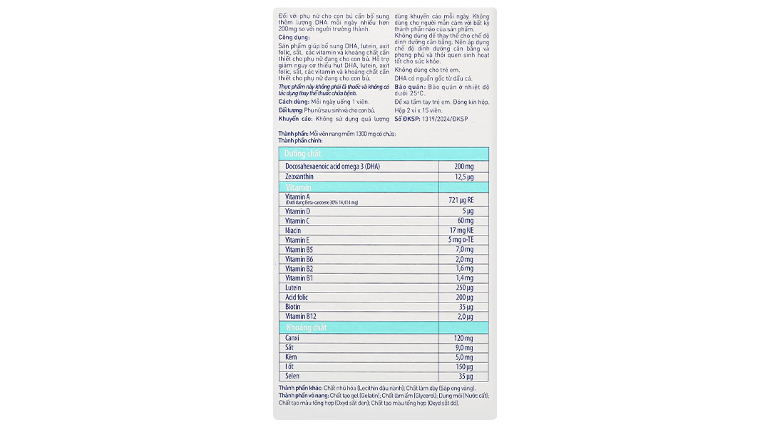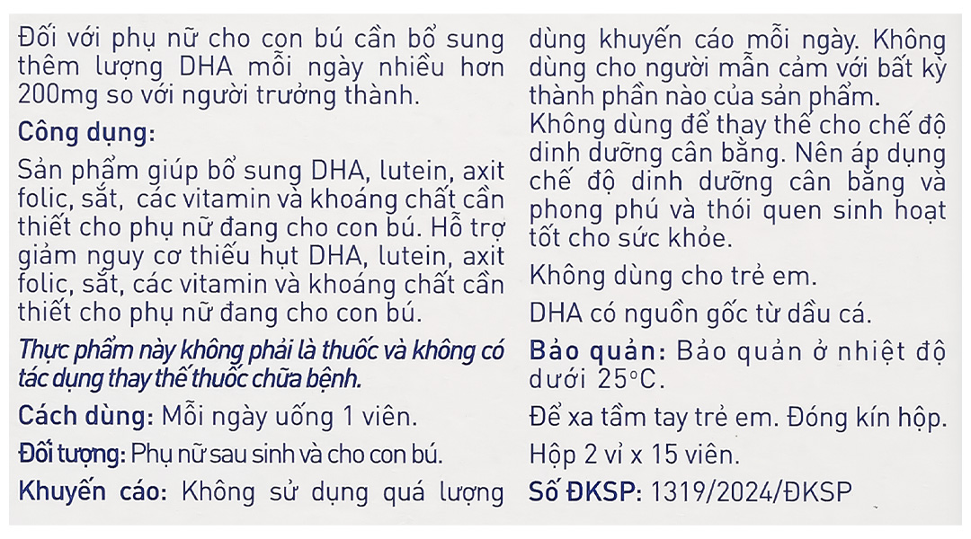 - Sản phẩm giúp bổ sung DHA, lutein, axit folic, sắt, các vitamin và khoáng chất cần thiết cho phụ nữ đang cho con bú.