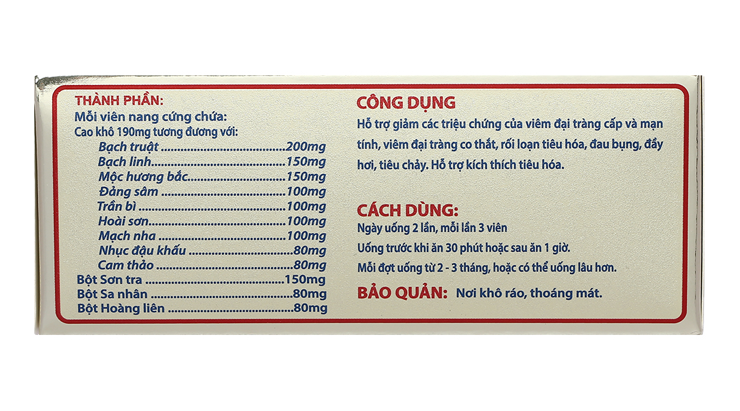 - Hỗ trợ giảm các triệu chứng của viêm đại tràng cấp và mạn tính, viêm đại tràng co thắt, rối loạn tiêu hóa, đau bụng, đầy hơi, tiêu chảy.