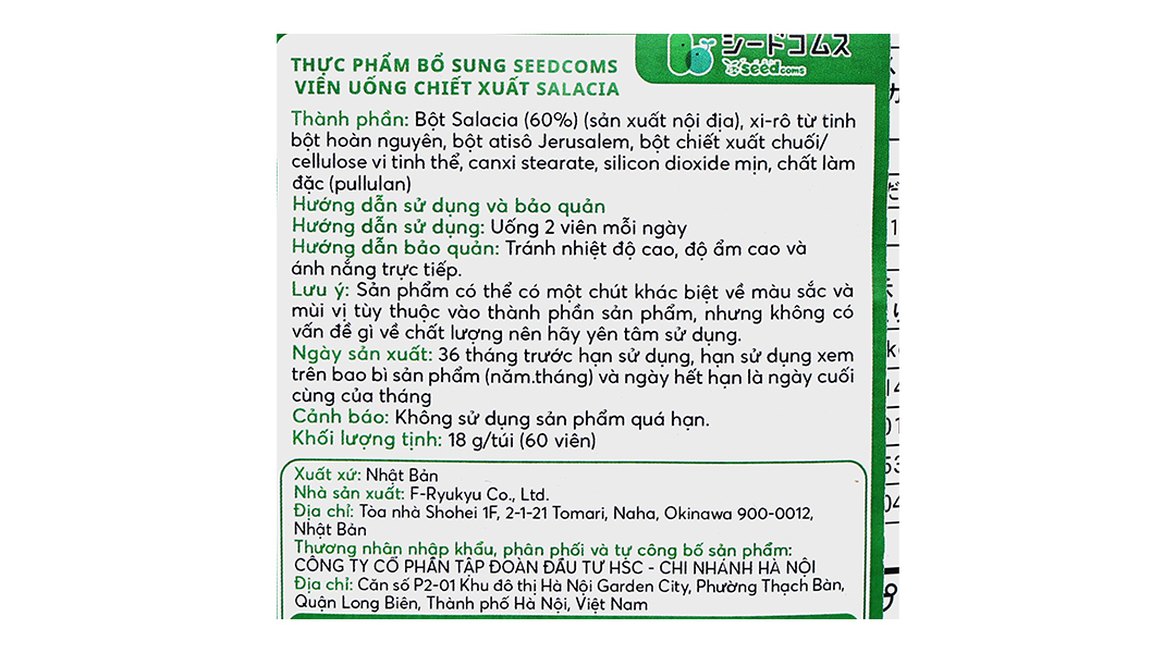 Bột Salacia (60%) (sản xuất nội địa), siro từ tinh bột hoàn nguyên, bột atisô Jerusalem, bột chiết xuất chuối/ cellulose vi tinh thể, canxi stearate, silicon dioxide mịn, chất làm đặc (pullulan).