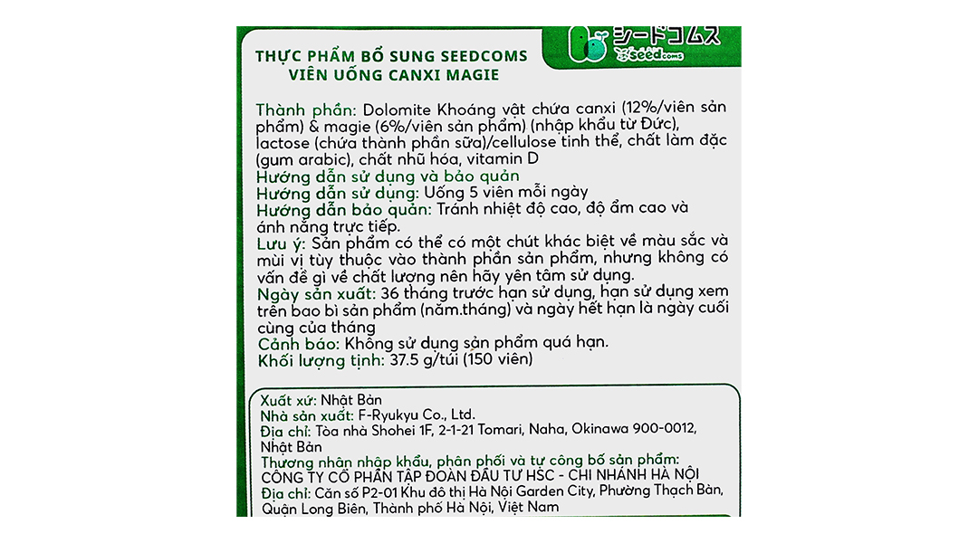Seedcoms Canxi Magie là sản phẩm bổ sung canxi và magie từ thương hiệu Seedcoms nổi tiếng của Nhật Bản, với hơn 10 năm kinh nghiệm trong ngành thực phẩm chức năng. Được sản xuất với các nguyên liệu chất lượng cao, đặc biệt là canxi và magie nhập khẩu từ Đức, sản phẩm không chỉ đảm bảo hiệu quả vượt trội mà còn an toàn cho người sử dụng.