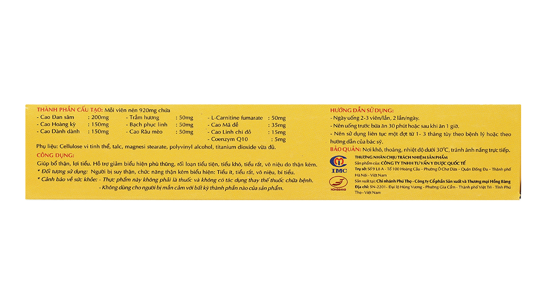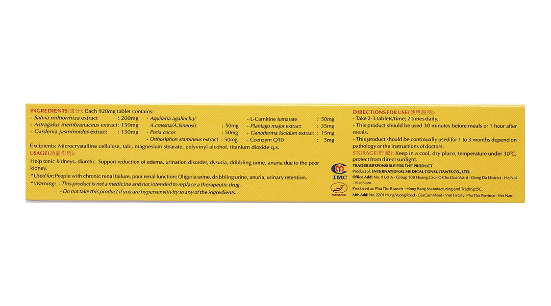 Hoạt chấtCao Đan sâm, Cao Mã đề, Coenzym Q10, Bạch phục linh, Cao Dành dành, Cao Linh chi, Cao Râu mèo, Cao Hoàng kỳ, L-Carnitine fumarate