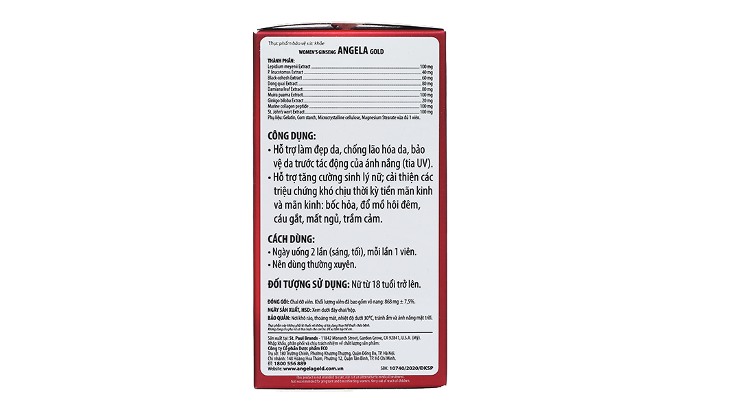 - Viên uống Angela Gold được sản xuất tại Hoa Kỳ, thuộc sở hữu của công ty St. Paul Brands. Tại Việt Nam, việc nhập khẩu và phân phối độc quyền sản phẩm Angela Gold được thực hiện bởi Công ty Cổ phần Dược phẩm ECO.