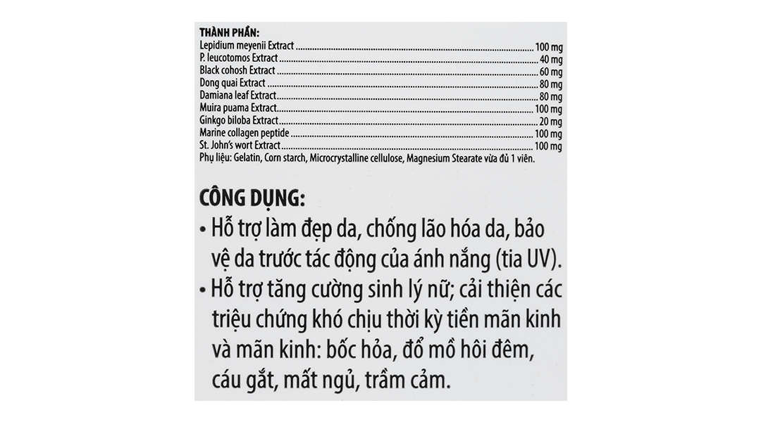 - Black cohosh Extract: Giảm các triệu chứng của thời kỳ mãn kinh như bốc hỏa, tâm trạng bất thường, nhịp tim tăng nhanh và khô âm đạo.