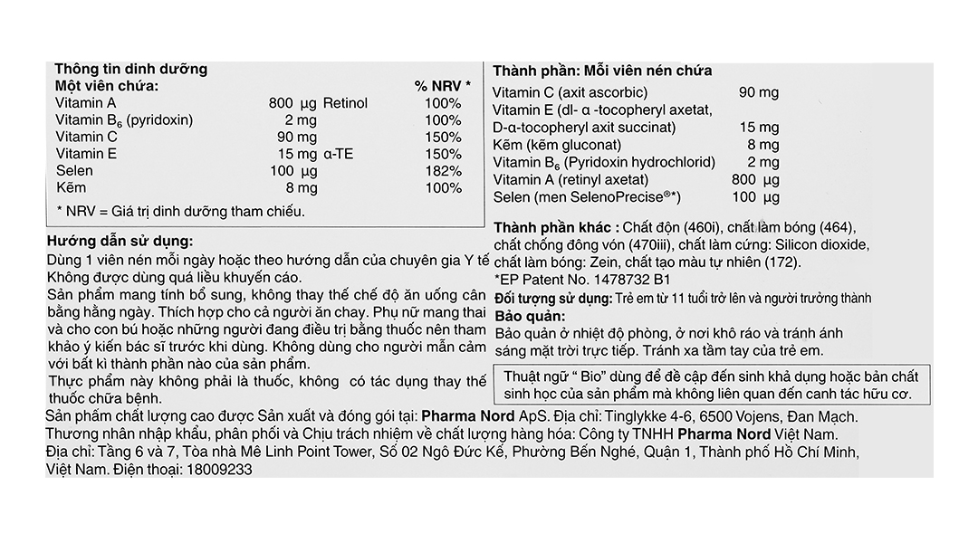 - Bio-Selenium + Zinc của Pharma Nord là một sản phẩm bổ sung dinh dưỡng giúp tăng cường sức khỏe tổng thể, bảo vệ cơ thể khỏi các tác động của gốc tự do và hỗ trợ hệ miễn dịch. Sản phẩm này sử dụng men selen hữu cơ SelenoPrecise, một thành phần đặc biệt đã được cấp bằng sáng chế, đảm bảo sự hấp thụ tối ưu và tác dụng lâu dài của selen trong cơ thể. Ngày nay, Pharma Nord là nhà sản xuất duy nhất trên thế giới được phép sản xuất men selen hữu cơ cấp độ y tế. Men selen này đã được nghiên cứu và chứng minh có hiệu quả vượt trội hơn so với các dạng selen vô cơ khác, vì nó chứa hơn 20 hợp chất selen tự nhiên có trong chế độ ăn giàu selen. Điều này giúp đảm bảo rằng cơ thể hấp thụ selen một cách hiệu quả và duy trì mức độ ổn định lâu dài trong suốt thời gian sử dụng.