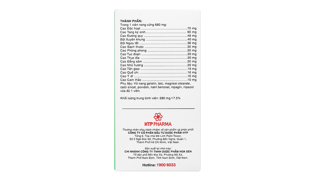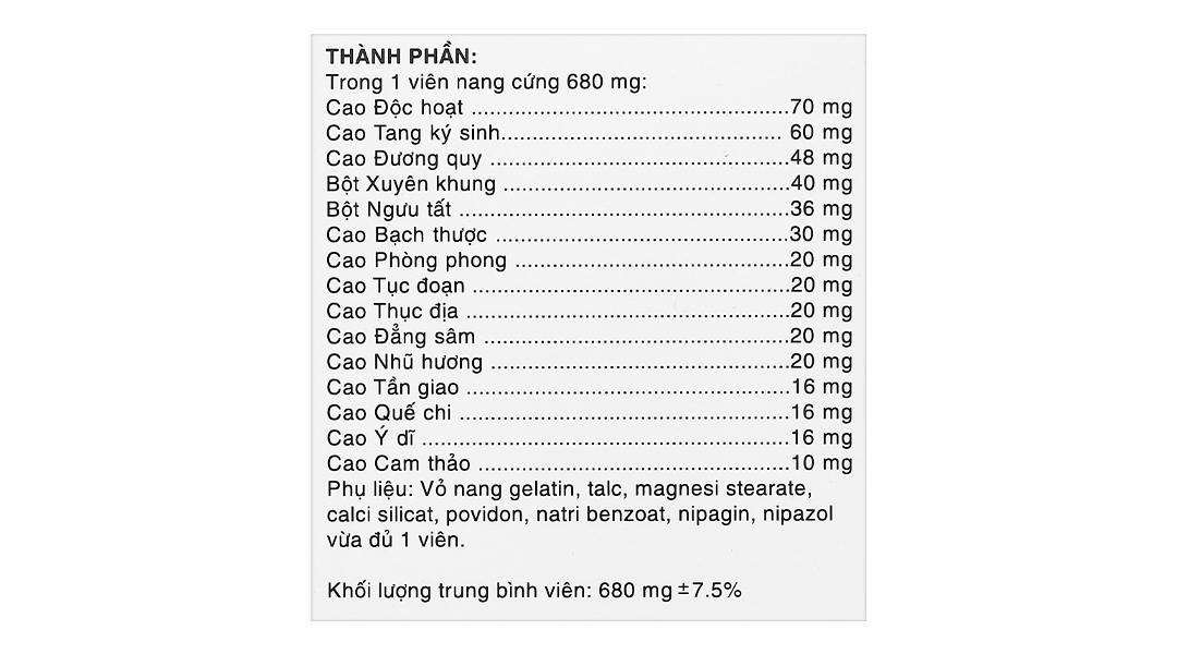 Hoạt chấtCao Quế chi, Bột Ngưu tất, Cao Bạch thược, Cao Độc hoạt, Cao Tần giao, Cao Tang ký sinh, Cao Đương quy, Cao Thục địa, Cao Phòng phong, Cao Ý dĩ, Cao Tục đoạn, Bột Xuyên khung, Cao Đẳng sâm, Cao Cam thảo, Cao Nhũ hương