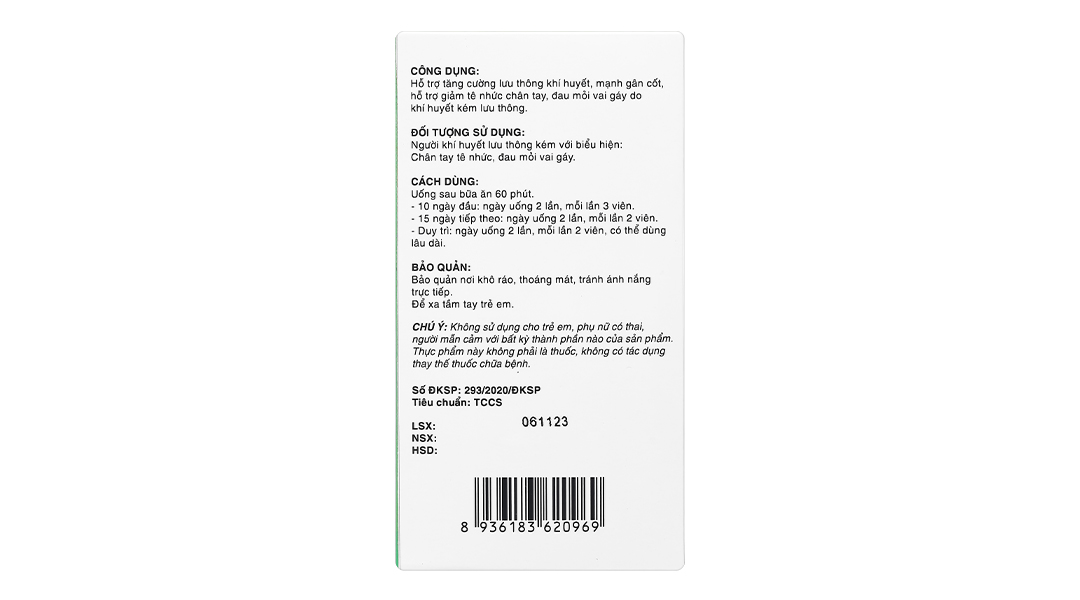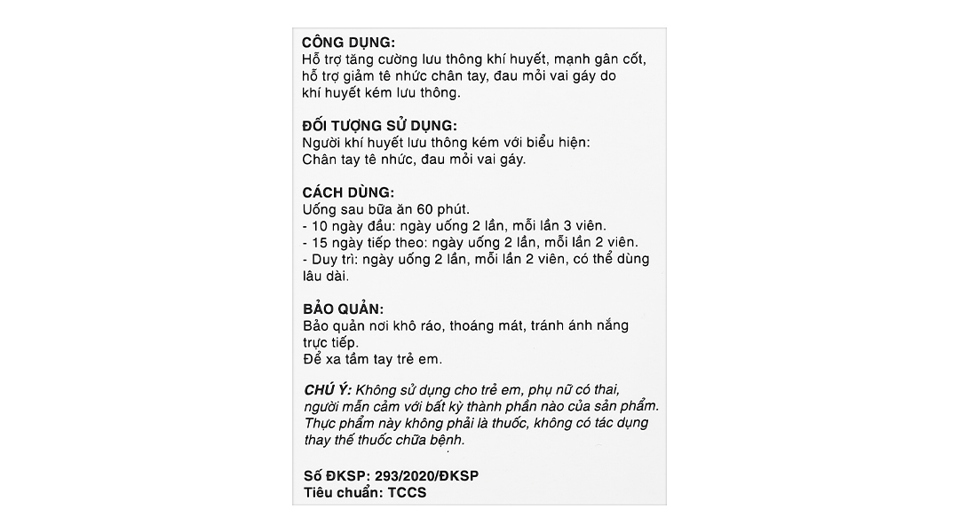 Đối tượng sử dụngNgười khí huyết lưu thông kém với biểu hiện: Chân tay tê nhức, đau mỏi vai gáy