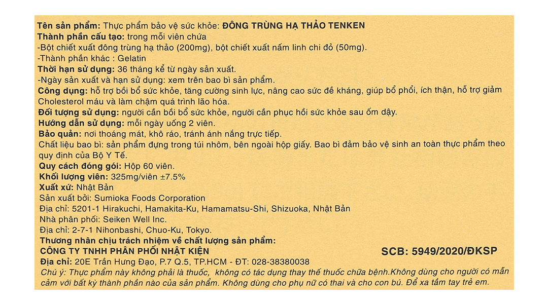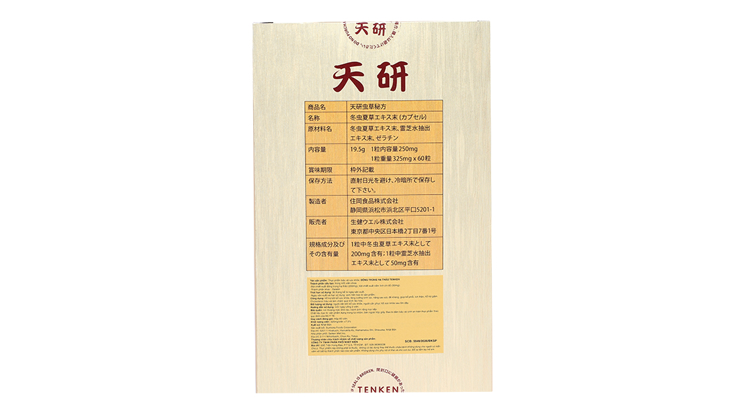 Đông Trùng Hạ Thảo Tenken từ đất nước mặt trời mọc được sản xuất ra để cung cấp cho khách hàng một sản phẩm chứa đông trùng hạ thảo thượng hạng, đạt chất lượng cao. Đồng thời còn bổ sung thêm tinh chất nấm linh chi đỏ để nâng cao hiệu quả bảo vệ sức khỏe.