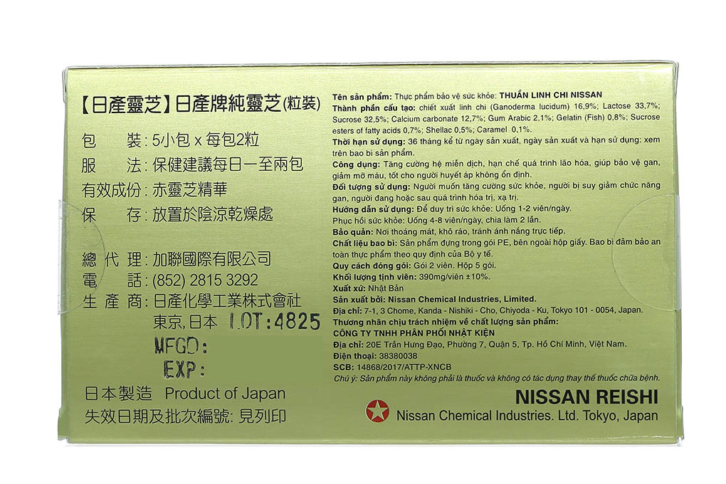 Chiết xuất linh chi (Ganoderma lucidum) 16.9%, Lactose 33,7%, Sucrose 32.5%, Calcium carbonate 12.7%, Gum Arabic 2.1%, Gelatin (Fish) 0.8%, Sucrose esters of fatty acids 0.7%, Shellac 0.5%, Caramel 0.1%.