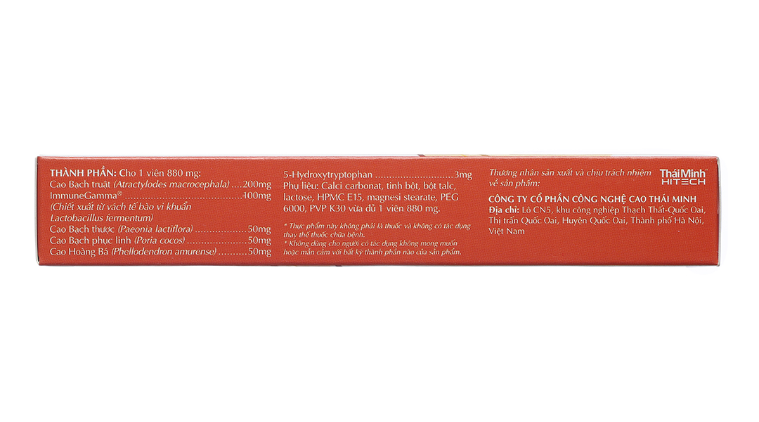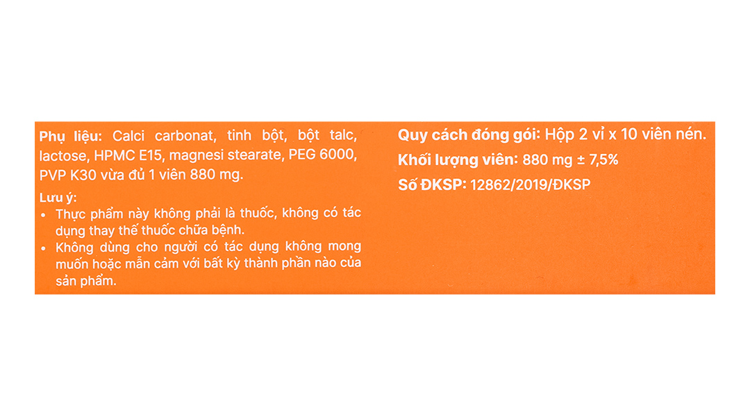Phụ liệu: Calci Carbonat, tinh bột, bột talc, lactose, HPMC E15, magnesi stearate, PEG 6000, PVP K30 vừa đủ 1 viên 880mg.