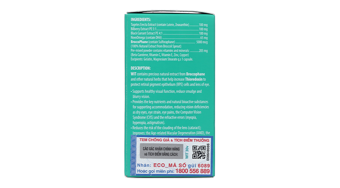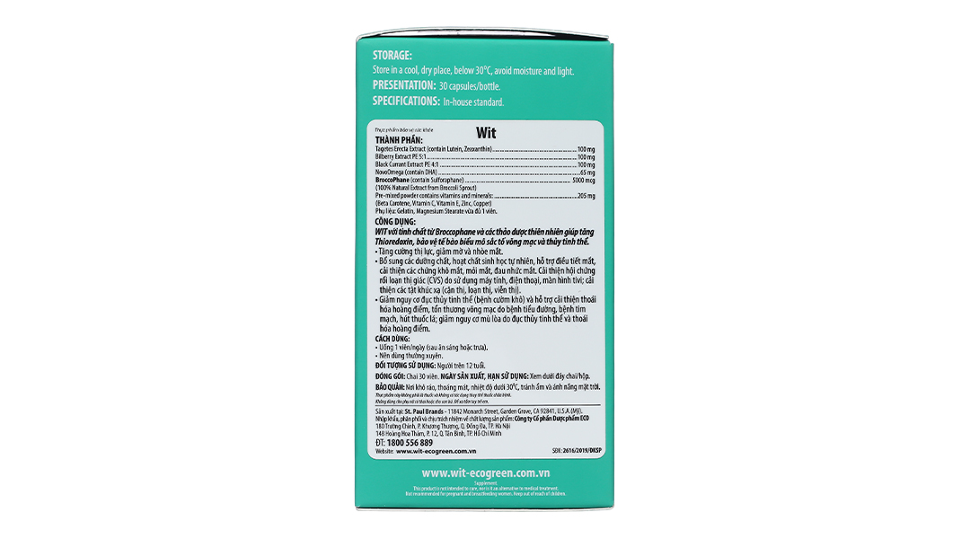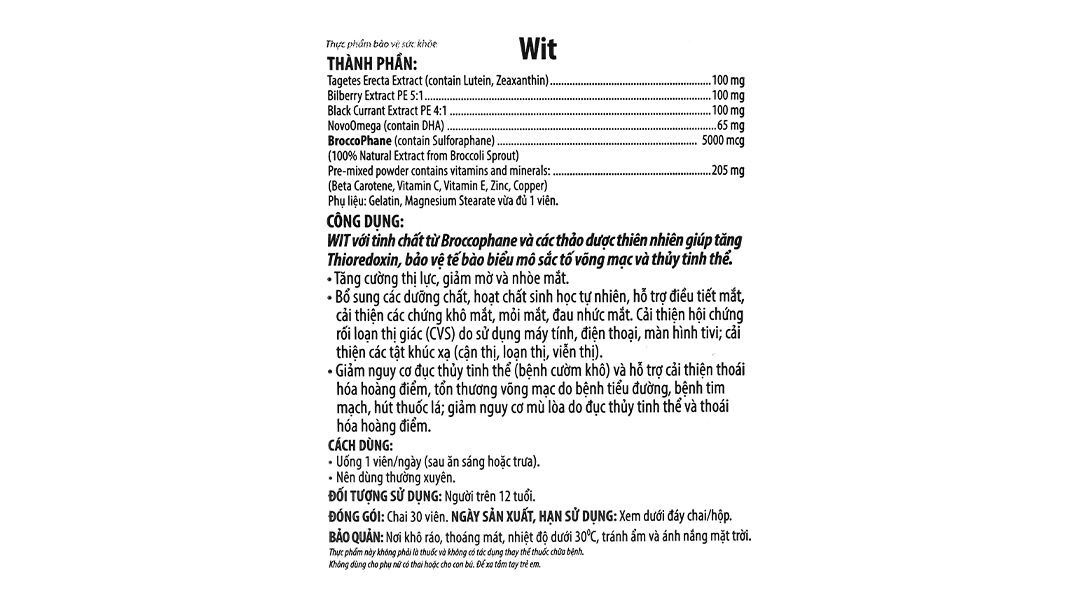 - Sản phẩm WIT 30 viên được sản xuất bởi công ty St. Paul Brands, trụ sở đặt tại Hoa Kỳ có chứa Broccophane (chiết xuất Broccoli) được chứng minh hỗ trợ tăng Thioredoxin, giúp bảo vệ tế bào biểu mô sắc tố võng mạc và thủy tinh thể, hỗ trợ tăng cường thị lực, giảm mờ và nhòe mắt.