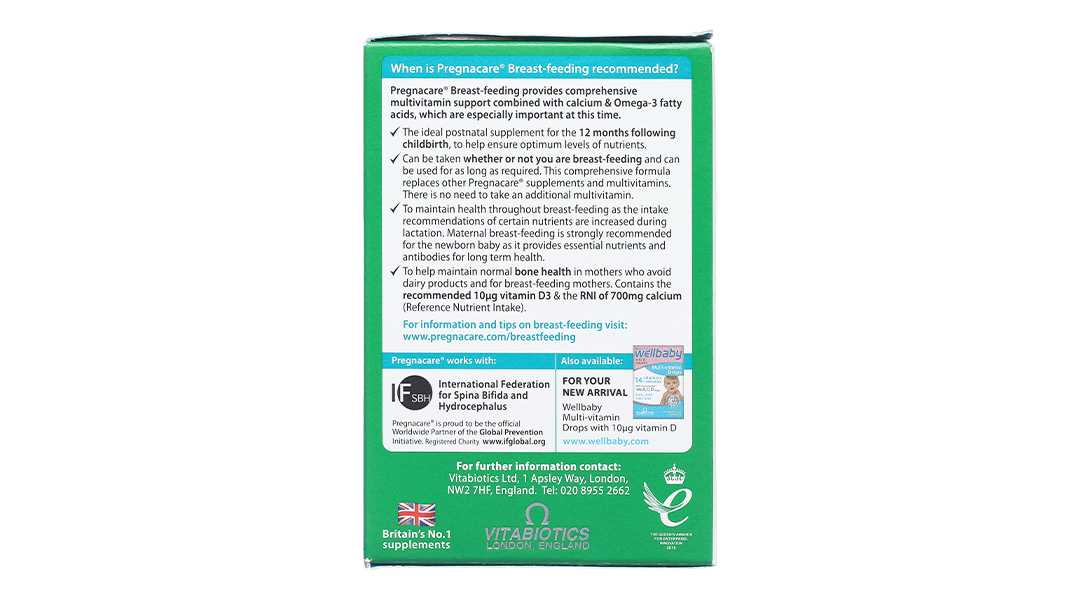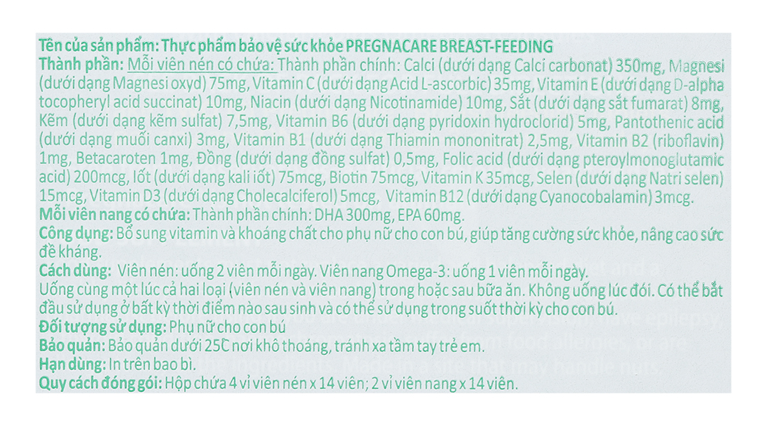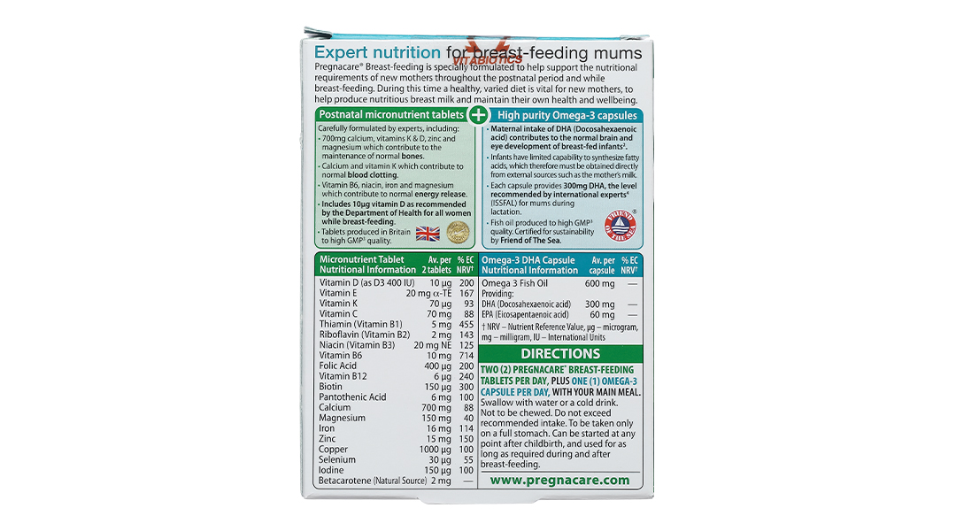 Pregnacare Breast-feeding là một sản phẩm trong dòng Pregnacare được dành cho các bà mẹ trong giai đoạn cho con bú. Đây là thời kỳ vô cùng quan trọng, không chỉ đối với sức khỏe của mẹ mà còn ảnh hưởng trực tiếp đến sự phát triển của trẻ. Sản phẩm được bào chế một cách tỉ mỉ, cung cấp những dưỡng chất thiết yếu giúp hỗ trợ sức khỏe toàn diện của bà mẹ sau sinh và đảm bảo chất lượng sữa cho bé. Pregnacare Breast-feeding là công thức kết hợp hoàn hảo giữa các thành phần cần thiết cho cả mẹ và bé, chứa một loạt các vitamin, khoáng chất và axit béo Omega-3 được khoa học chứng minh là có tác dụng quan trọng trong việc duy trì sức khỏe của mẹ và sự phát triển của trẻ sơ sinh.