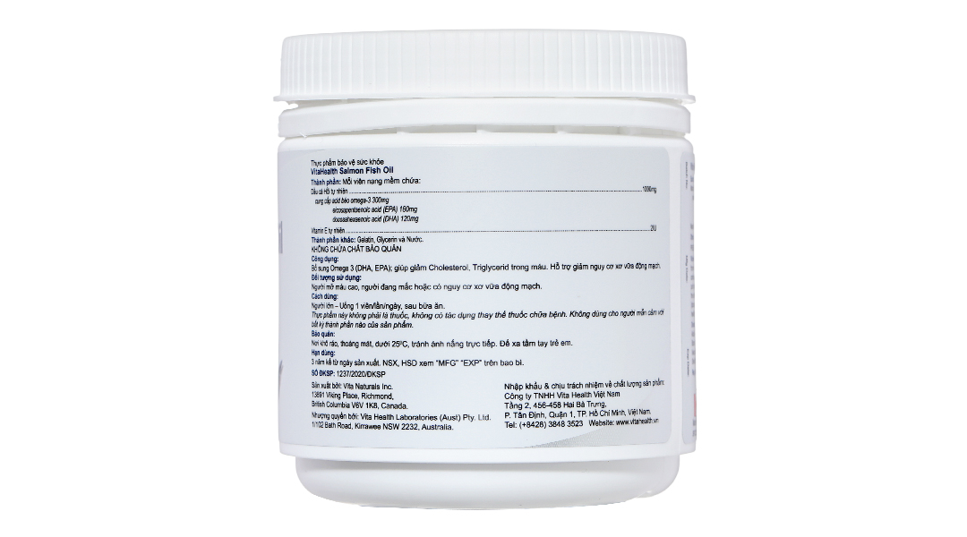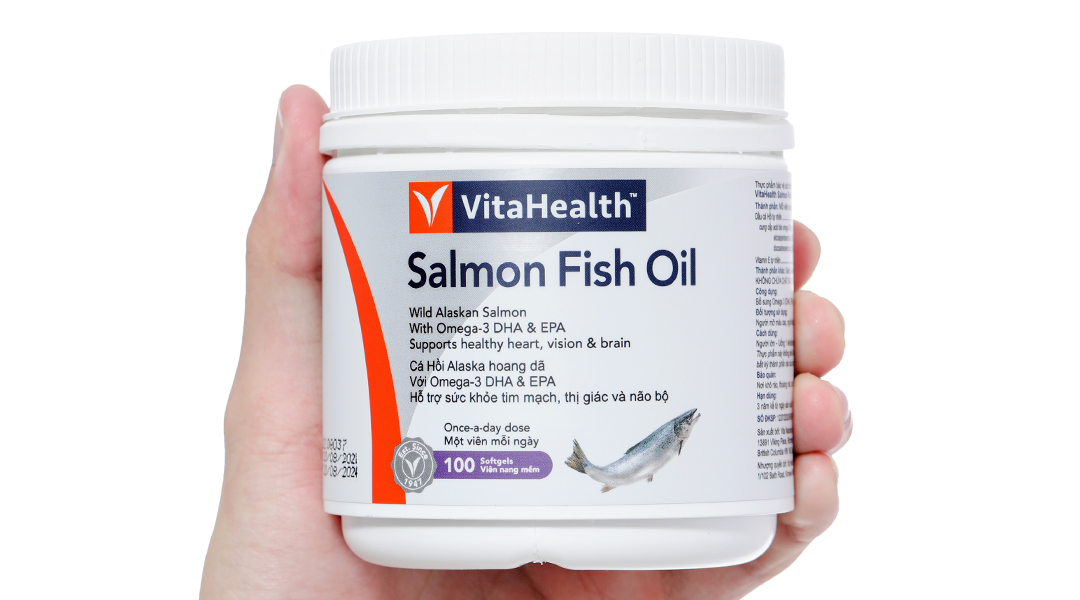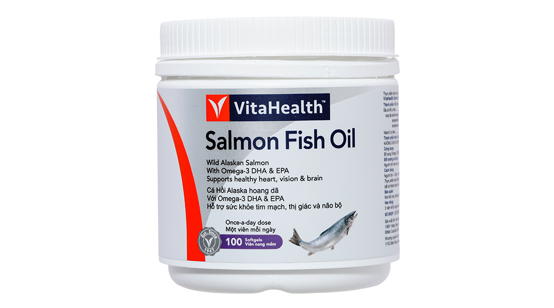 - Dầu cá VitaHealth Salmon Fish Oil là sản phẩm giúp bạn bảo vệ sức khỏe tim mạch từ sâu bên trong. Sản phẩm được chiết xuất từ nguồn cá hồi hoang dã vùng Alaska với thành phần giàu Omega-3 tinh khiết, sản phẩm cung cấp tới 300 mg acid béo Omega-3 mỗi viên giúp bảo vệ hệ tim mạch và cải thiện sức khỏe tổng thể.