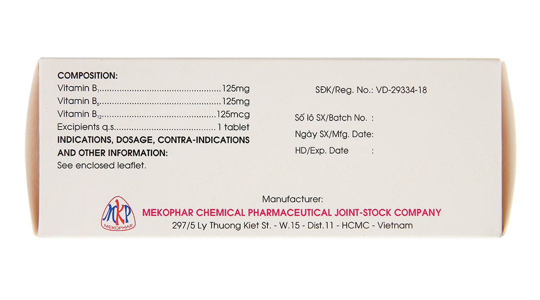 - Hoạt chất: Thiamine mononitrate (Vitamin B1) 125mg, Pyridoxin hydrochloride (Vitamin B6) 125mg, Cyanocobalamin (Vitamin B12) 125mcg.