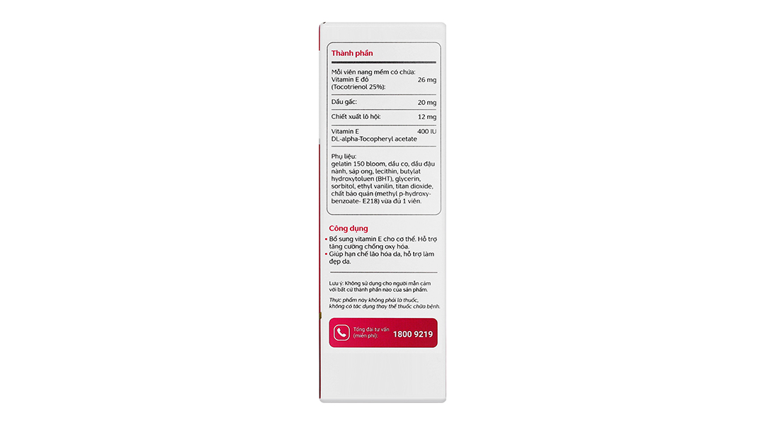 - Vitamin E đỏ (Tocotrienol 25%): Vitamin E đỏ không chỉ là một chất bổ sung chăm sóc da mà còn đóng vai trò quan trọng trong việc hỗ trợ sức khỏe tổng thể, đặc biệt là trong trường hợp thiếu vitamin E. Là một chất chống oxy hóa mạnh, vitamin E đỏ giúp bảo vệ các tế bào da khỏi bị tổn thương do các gốc tự do và tia UV gây ra. Vitamin E đỏ giúp làm đều màu da, giảm sự xuất hiện của các đốm đen và mang lại cho làn da vẻ rạng rỡ tự nhiên, khỏe mạnh, làm chậm quá trình lão hóa da, dưỡng ẩm cho da.