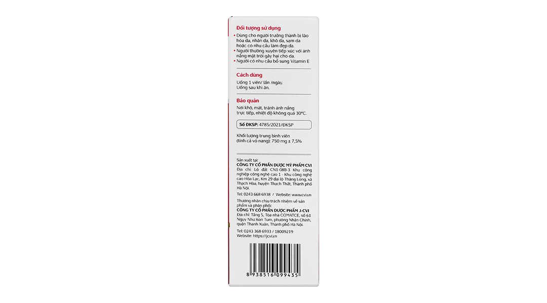 - Vitamin E trong sản phẩm giúp bảo vệ tế bào khỏi sự tấn công của các gốc tự do, ngăn ngừa quá trình lão hóa và cải thiện độ đàn hồi của da. Việc bổ sung Vitamin E giúp duy trì sự tươi trẻ cho da, giảm thiểu tình trạng khô da, sạm màu, và các dấu hiệu lão hóa sớm. Ngoài ra, Vitamin E còn hỗ trợ làm đẹp da từ bên trong, giúp da trở nên mịn màng, sáng khỏe hơn.