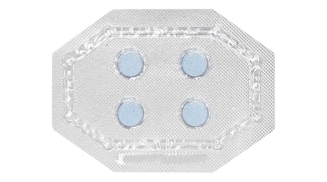 Viên nén, tròn, màu xanh nhạt, có rạch chéo trên một mặt.