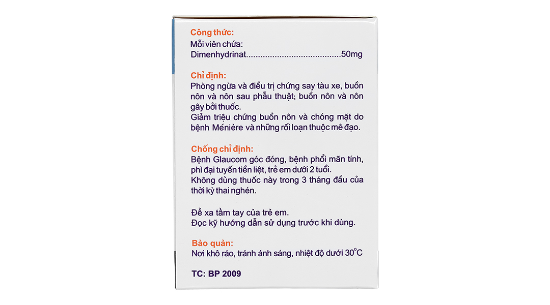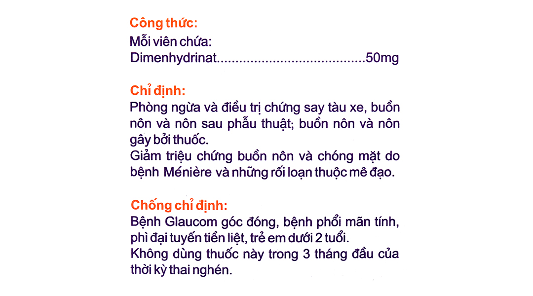 - Mỗi viên nén chứa: Dimenhydrinate 50 mg.