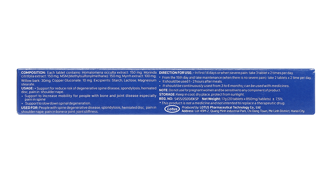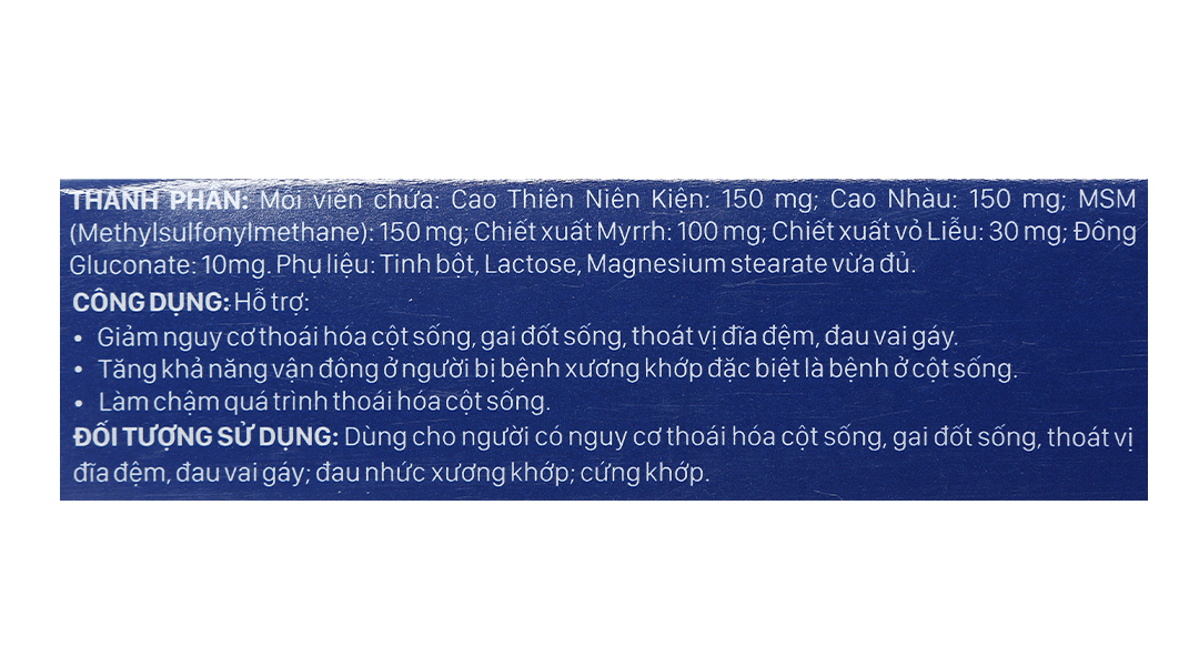 Cao Thiên Niên Kiện 150mg, Cao Nhàu 150mg, MSM (methylsulfonylmethane) 150mg, Chiết xuất Myrrh 100mg, Chiết xuất vỏ Liễu: 30mg, Đồng Gluconate 10mg.
