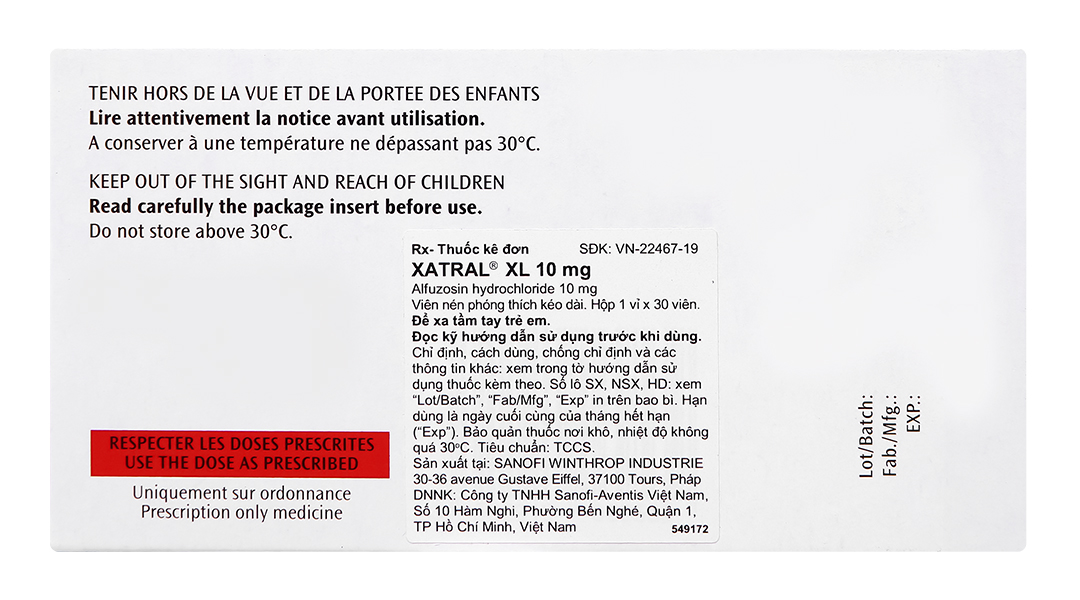 – Thận trọng khi sử dụngMột số người nhạy cảm đặc biệt với Xatral XL 10mg, được biểu hiện bởi hạ huyết áp khi chuyển từ tư thế nằm sang đứng dậy. Hiện tượng này có thể xuất hiện trong vài giờ đầu sau khi dùng thuốc và đi kèm với các triệu chứng sau: Chóng mặt, mệt mỏi, đổ mồ hôi. Nếu trường hợp này xảy ra bệnh nhân cần được đặt ở từ thế nằm cho đến khi những triệu chứng tạm thời này hoàn toàn biến mất. Cần thận trọng, nhất là đối với người lớn tuổi và những bệnh nhân đã từng bị hạ huyết áp khi dùng các thuốc cùng nhóm chẹn alpha. Hội chứng mềm mống mắt trong phẫu thuật (IFIS): Nếu bạn đang dự định trải qua phẫu thuật chứng đục thủy tinh thể (cườm khô) trong tương lai gần và nếu bạn đã hoặc đang sử dụng Xatral XL 10mg, hãy thông báo cho bác sĩ của bạn biết trước khi phẫu thuật. Xatral XL 10mg có thể gây tác dụng phụ và dẫn đến biến chứng trong lúc phẫu thuật. Tuy nhiên, nếu được thông báo, phụ thuộc vào quá trình điều trị của bạn, bác sĩ sẽ phải thận trọng lúc phẫu thuật. Thận trọng khi dùng