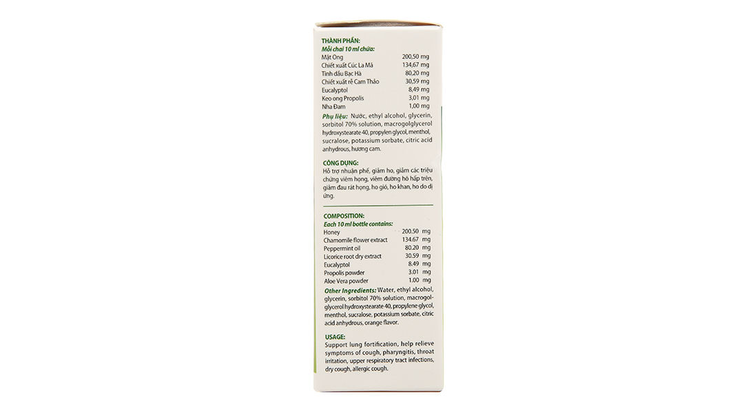 Mật ong: 200,50 mg; Chiết xuất Cúc La Mã 134,67 mg; Tinh dầu Bạc Hà 80,20 mg; Chiết xuất rễ Cam Thảo 30,59 mg; Eucalyptol 8,49 mg; Keo ong Propolis 3,01 mg; Nha Đam 1,00 mg.