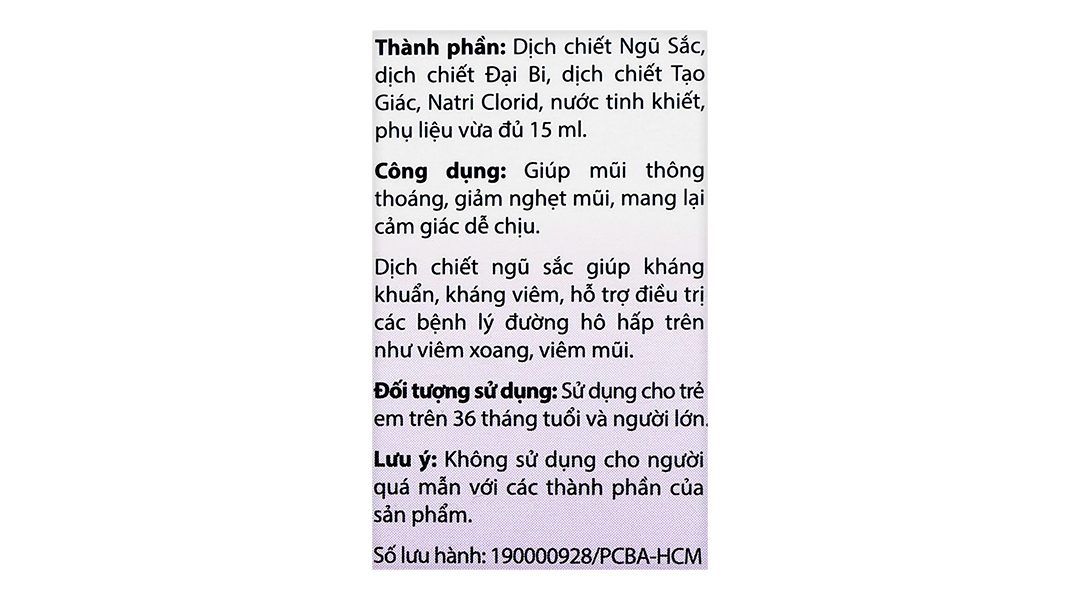 Mỗi lọ 15 ml chứa: Dịch chiết Ngũ sắc, dịch chiết Đại Bi, dịch chiết Tạo Giác, Natri clorid, Acid boric, Natri borat, Glycerin, Nipagin, Nipazol, Nước tinh khiết.