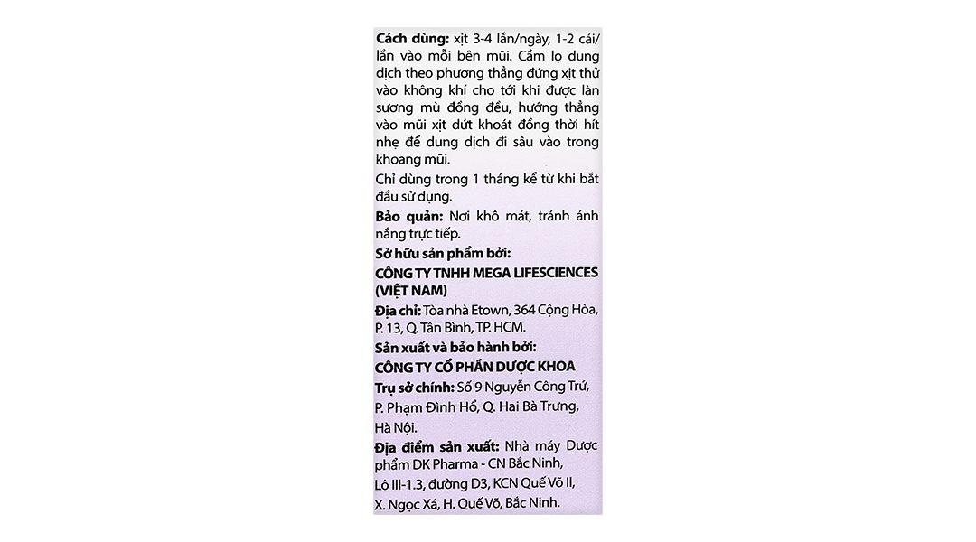 Xịt 3 – 4 lần/ngày, mỗi lần 1 – 2 cái vào mỗi bên mũi.