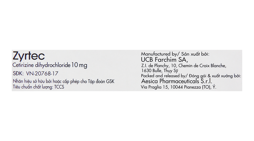 - Hoạt chất: 10mg Cetirizine dihydrochloride.